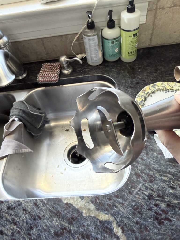 One of the first of the healthy meals this year ended up with some particularly nasty results- my first really good cooking accident. I was making a healthy meal and it called for putting some greens in a food processor to make a sauce. We dont have a food processor, so I was using our “immersion blender”. Some of the thick sauce was on the blade, so I was getting it out with my finger, and my palm hit the sensitive power button. Taylor likes some things that make me squeamish, so I am going to share: