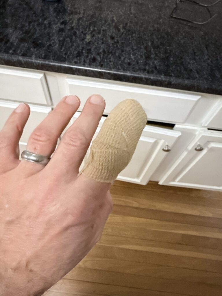 It doesnt look like much, but as far as I can tell, the blade went 1/4 through my finger 6 times. When taking the princess bandage off the next morning,the pain was incredibly intense. I saw an urgent care doc the next day who cleaned it well, and told me to keep it clean and change the bandages regularly for a week to keep it from getting infected.